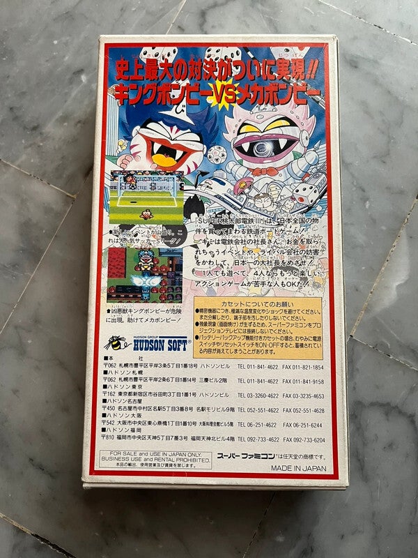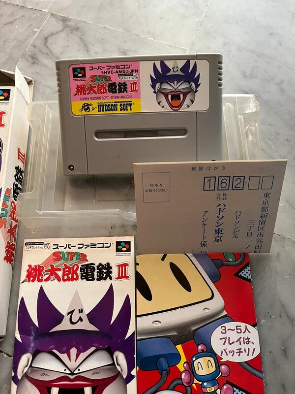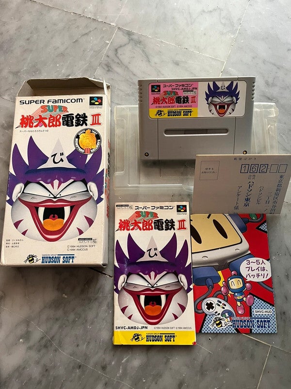 Jeu Super Nintendo Famicom SNES version Jap SUPER MOMOTARO DENSETSU 3 Complet avec cartouche de jeu et notice de jeu et documents Nintendo REG Card et cale en plastique dans boîtier en très bon état fonctionne avec Super Famicom ou avec adaptateur Super Nintendo SNES