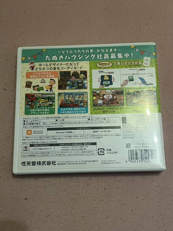 Jeu Nintendo 3ds version Japan ANIMAL CROSSING HAPPY HOME DESIGNER avec cartouche de jeu et documents Nintendo il n’y a pas de notice et boîtier en très bon état voir les photos
